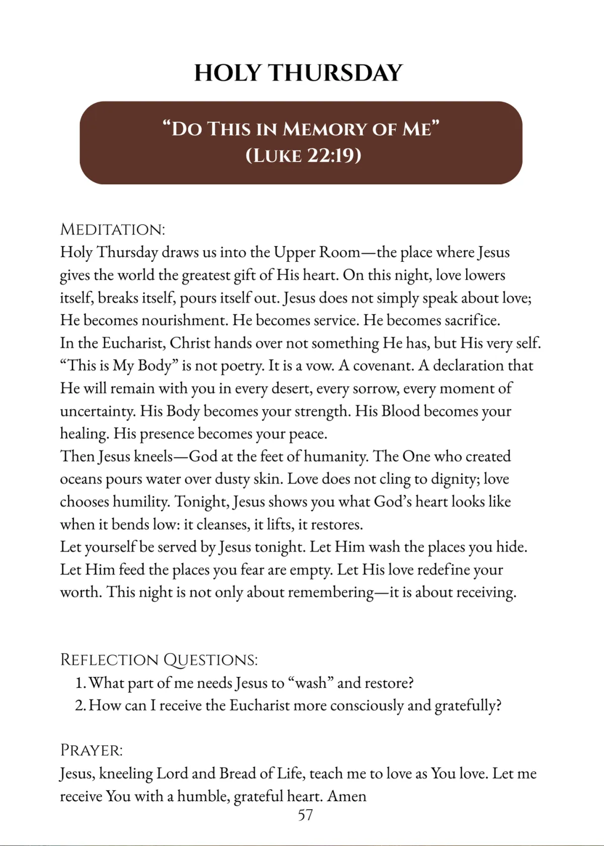 Throughout Lent, Return to Me helps you enter more fully into the call of conversion, preparing your heart for the saving mysteries of the Passion. The journey then deepens as the book leads you into the sacred days of the Paschal Triduum, offering richer context and focused meditations for Holy Thursday, Good Friday, Holy Saturday, and Easter Sunday—guiding you from sacrifice and surrender into the joy of the Resurrection.