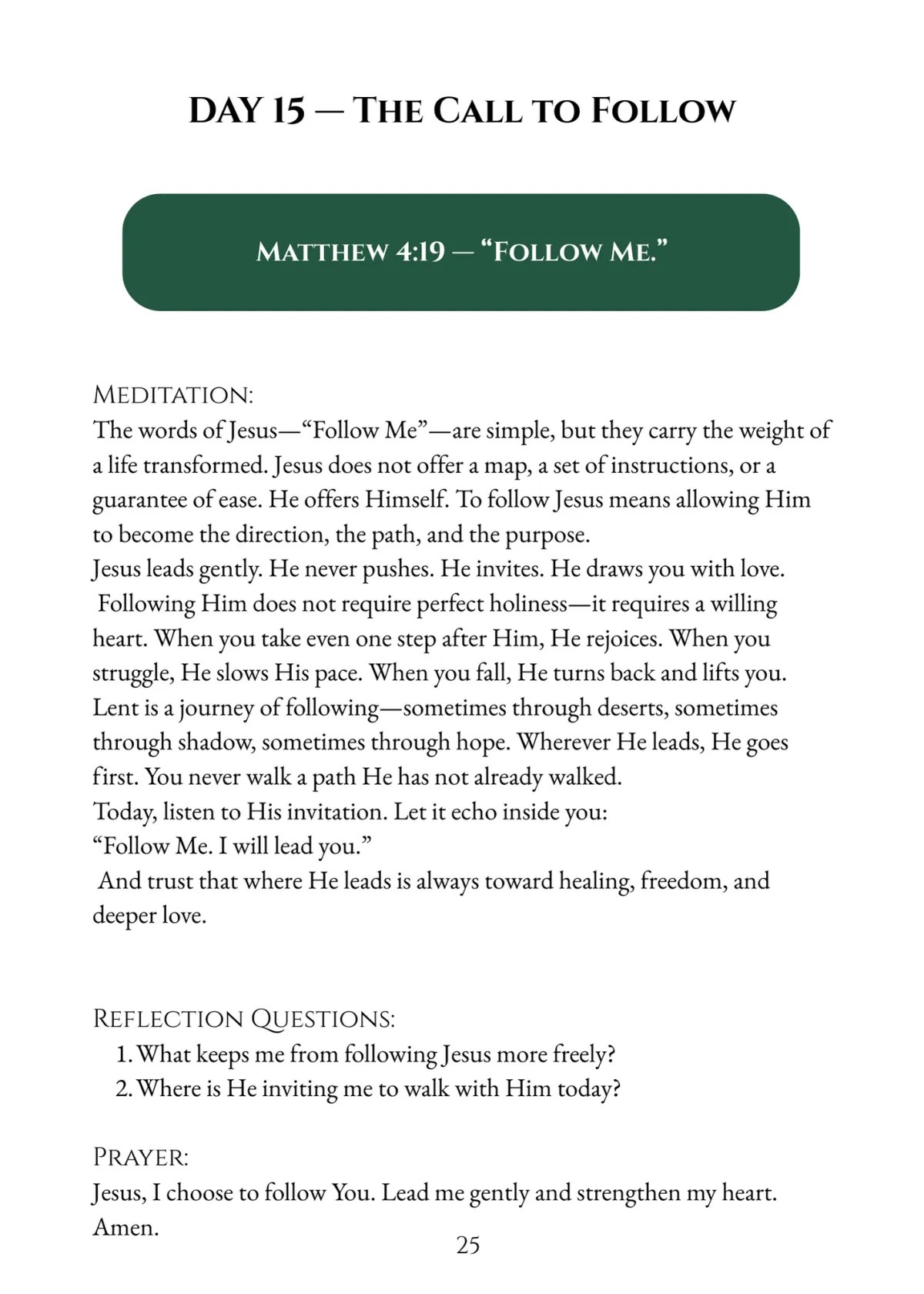 Each day offers a carefully crafted rhythm of Scripture, a contemplative meditation, thoughtful reflection questions, and a closing prayer. Together, these elements create space for honest self-examination, personal healing, and a renewed encounter with Christ’s mercy. This is not simply a book to read, but a guide to pray with—designed to meet you in the quiet moments where God speaks most clearly.